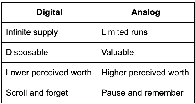 The answer lies not in the outcome but in the process. Analog is less about how it looks, and more about how it feels to make and to experience.
